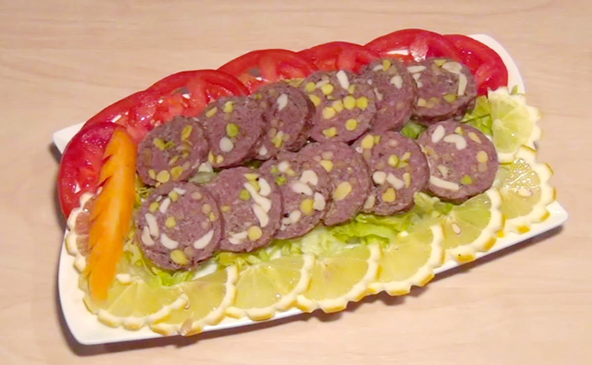 ٤. أكلة شامية تتكون من لحم غنم هبرة متبله بالفستق الحلبي والصنوبر والزيت النباتي والزنجبيل والفلفل