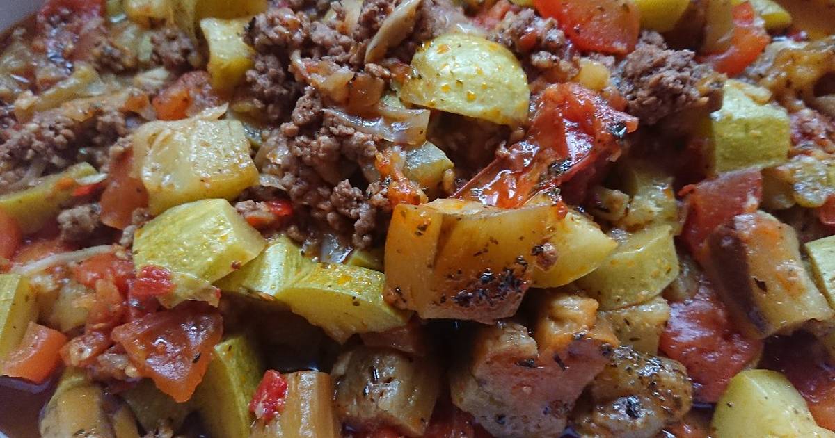٣. طبخة شامية تتكون من بيتنجان وكوسا وبندورة وبصل ولحمة ونعنع وليمون وثوم