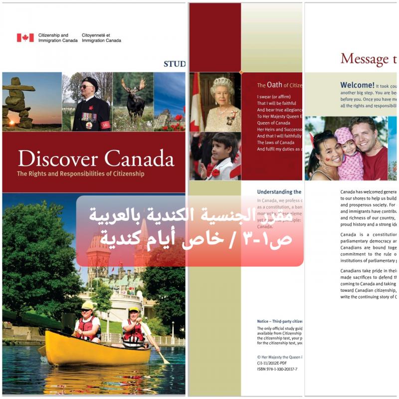 تنويه مهم: تجاوزاً تمت ترجمة كتاب Discover Canada بالعربية بهدف مساعدة من لديه ضعف بالإنكليزية أو الفرنسية لاستيعاب مقرر الجنسية عند الحاجة، (ولا ننسى أن من واجب المتقدمين للجنسية أن يكون لديهم معرفة كافية بإحدى اللغتين الإنكليزية أو الفرنسية). لا شك أن الترجمة تساعد وهي حل أخير، ولكن لا تغني أبداً عن قراءة ودراسة الكتاب باللغة الإنكليزية أو الفرنسية لأن الاختبار بالنهاية لن يكون بالعربية.