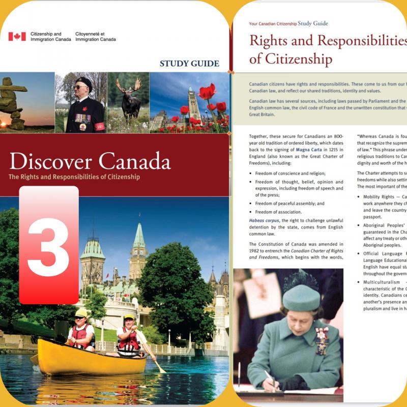 تنويه مهم: تجاوزاً تمت ترجمة كتاب Discover Canada بالعربية بهدف مساعدة من لديه ضعف بالإنكليزية أو الفرنسية لاستيعاب مقرر الجنسية عند الحاجة، (ولا ننسى أن من واجب المتقدمين للجنسية أن يكون لديهم معرفة كافية بإحدى اللغتين الإنكليزية أو الفرنسية). لا شك أن الترجمة تساعد وهي حل أخير، ولكن لا تغني أبداً عن قراءة ودراسة الكتاب باللغة الإنكليزية أو الفرنسية لأن الاختبار بالنهاية لن يكون بالعربية.