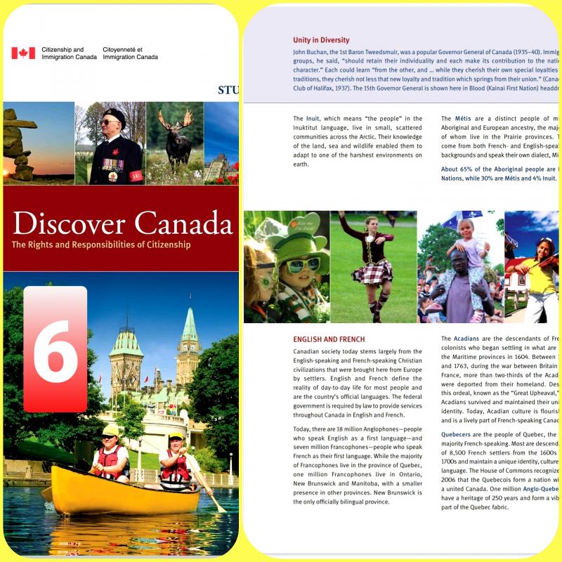 تنويه مهم: تجاوزاً تمت ترجمة كتاب Discover Canada بالعربية بهدف مساعدة من لديه ضعف بالإنكليزية أو الفرنسية لاستيعاب مقرر الجنسية عند الحاجة، (ولا ننسى أن من واجب المتقدمين للجنسية أن يكون لديهم معرفة كافية بإحدى اللغتين الإنكليزية أو الفرنسية). لا شك أن الترجمة تساعد وهي حل أخير، ولكن لا تغني أبداً عن قراءة ودراسة الكتاب باللغة الإنكليزية أو الفرنسية لأن الاختبار بالنهاية لن يكون بالعربية.