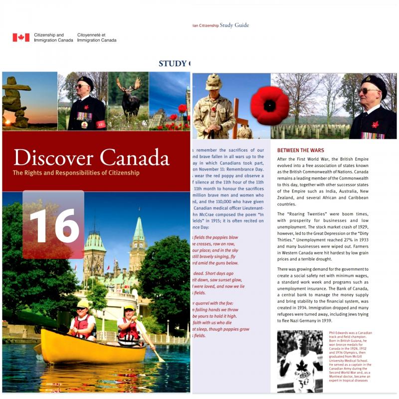 تنويه مهم: تجاوزاً تمت ترجمة كتاب Discover Canada بالعربية بهدف مساعدة من لديه ضعف بالإنكليزية أو الفرنسية لاستيعاب مقرر الجنسية عند الحاجة، (ولا ننسى أن من واجب المتقدمين للجنسية أن يكون لديهم معرفة كافية بإحدى اللغتين الإنكليزية أو الفرنسية). لا شك أن الترجمة تساعد وهي حل أخير، ولكن لا تغني أبداً عن قراءة ودراسة الكتاب باللغة الإنكليزية أو الفرنسية لأن الاختبار بالنهاية لن يكون بالعربية.